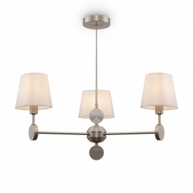Металлическая арматура. Цвет – никель. Сатиновые абажуры оригинальной формы. Актуальное сочетание геометричных линий и округлых силуэтов. Одиночный подвес с цоколем Е27, лампа, бра и люстры – Е14.